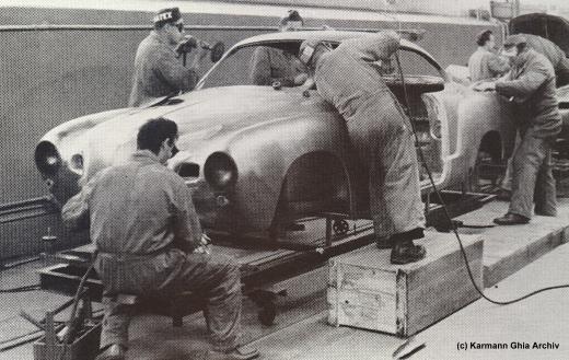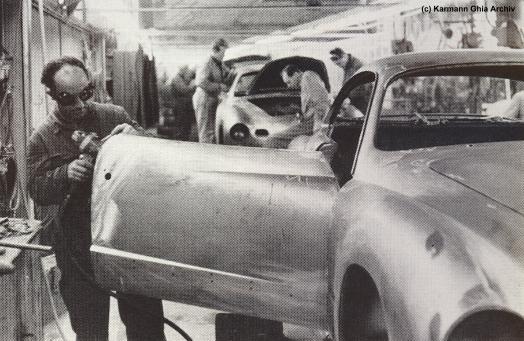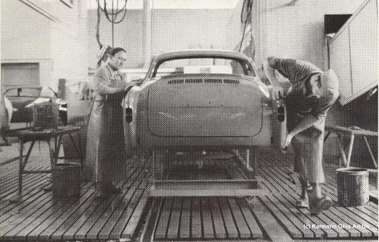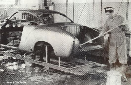 In den Jahren 1957 bis 1960 gab es eine Karmann Ghia Produktion in der Schweiz. Die Rohkarosserien werden angeliefert und müssen mühsam vom Konservierungsmittel befreit werden. Türen und Hauben wurden in Osnabrück nur eingehängt oder aufgelegt. vor dem lackieren werden die Karosserien geschliffen und gebürstet Inspektoren kennzeichnen die Stellen an denen nachgebessert werden muß. Erst wenn alles stimmt gehen die Fahrzeuge in die Lackierei Zur Lackierung werden die gleichen Farben wie in Osnabrück verwendet... ...auch die Innenausstattung ist die gleiche. Hier wird der Dachhimmel eingepaßt. Die Fahrgestelle liefert Volkswagen. Es benötigt jedoch einige Handgriffe um sie zur Montage vorzubereiten. Die Hochzeit vereinigt die Karosserie mit dem Chassis